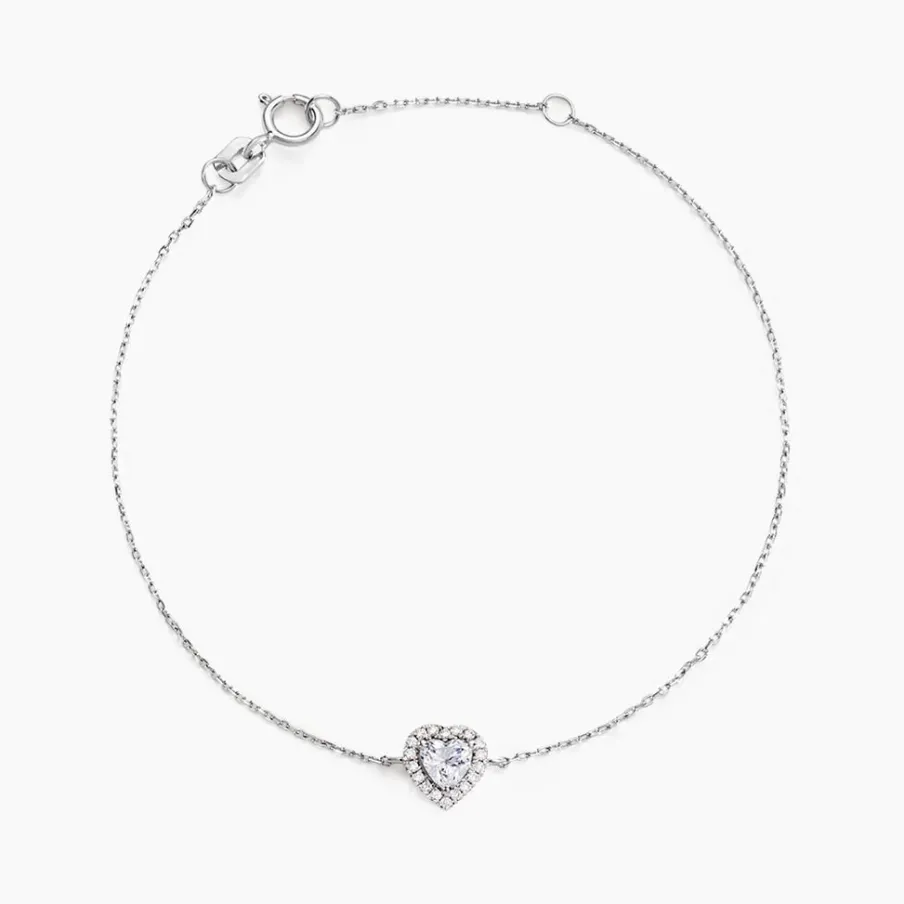 Bracelet Or Blanc 375/1000 C艙ur Central Et Entourage Oxydes De Zirconium Maille Forçat 16+2cm