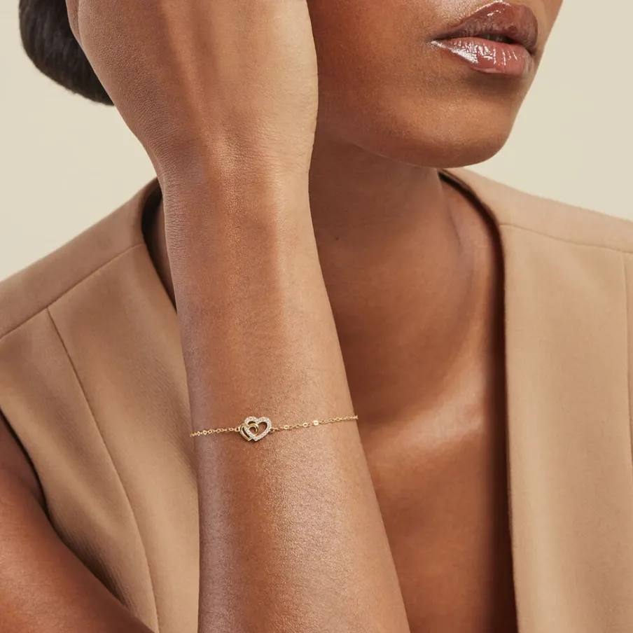 Bracelet Or Jaune 375/1000 Double C艙urs Ajoures Oxydes De Zirconium Sertis Griffes Maille Forcat 16+2cm