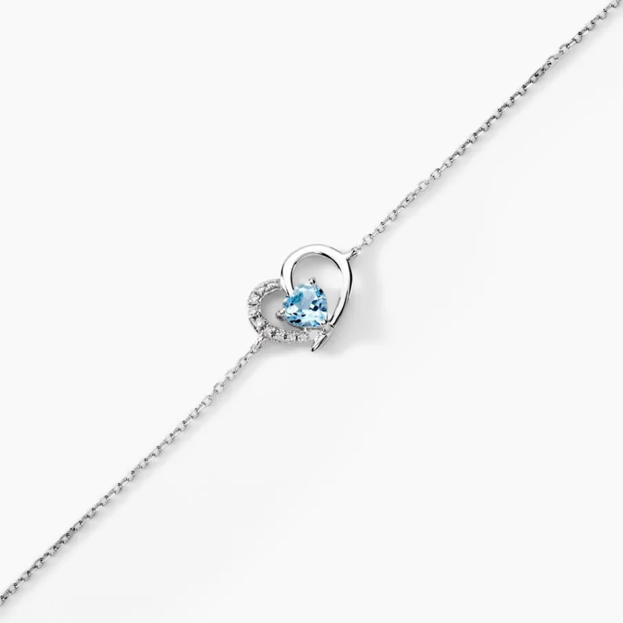 Bracelet Or Blanc 375/1000 Forme C艙ur Topaze Bleue Centrale Et Oxydes De Zirconium 19cm