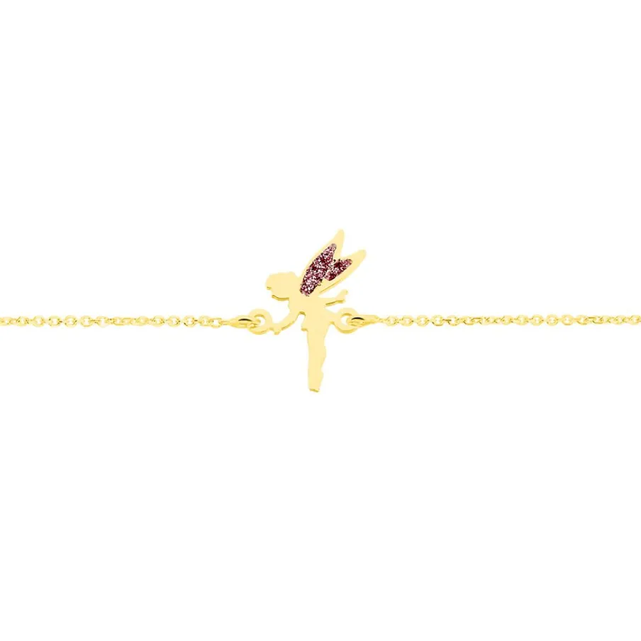 Bracelet Or Jaune 375/1000 Motif Fee Glitter Rose Maille Jaseron 14cm