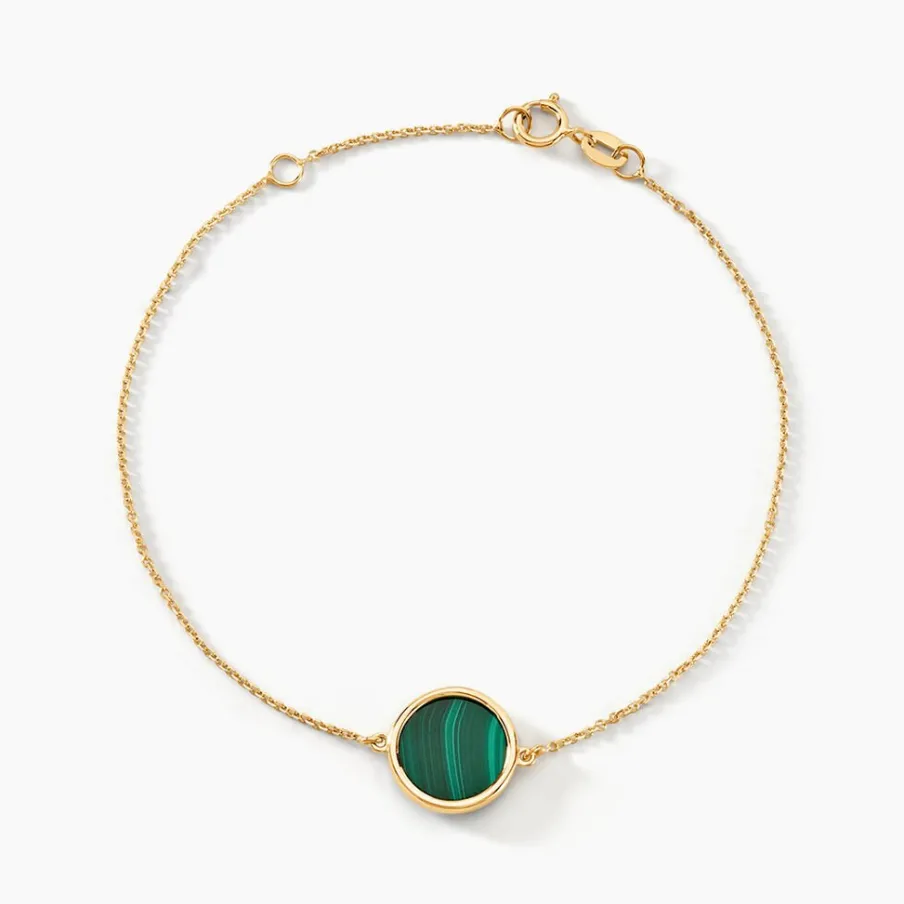 Bracelet Or Jaune 375/1000 Cercle Malachite Verte Maille Jaseron 16+2cm