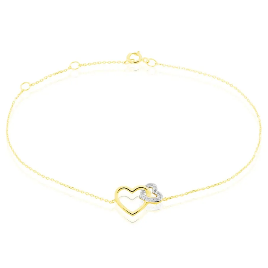 Bracelet Or Jaune 375/1000 Forme Double C艙ur Maille Forçat Pavage Diamants Micro Setting 18.5cm