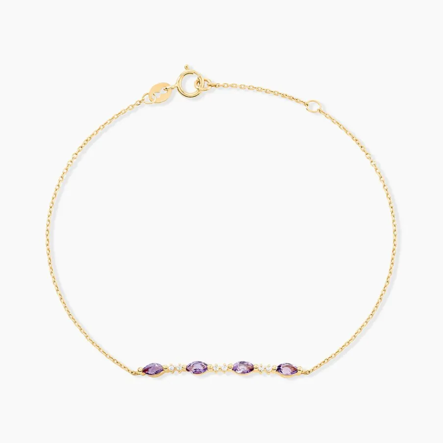 Bracelet Or Jaune 375/1000 Amethyste Navettes Sertis 2 Griffes Accompagnees D’Oxydes De Zirconium Maille Forcat 16+2Cm
