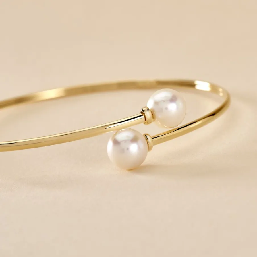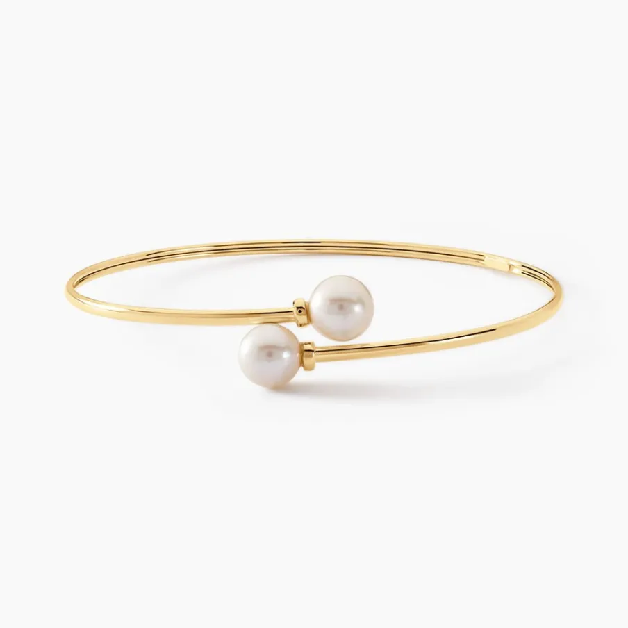 Bracelet Or Jaune 375/1000 Jonc Flexible Avec Double Perles De Culture Blanches