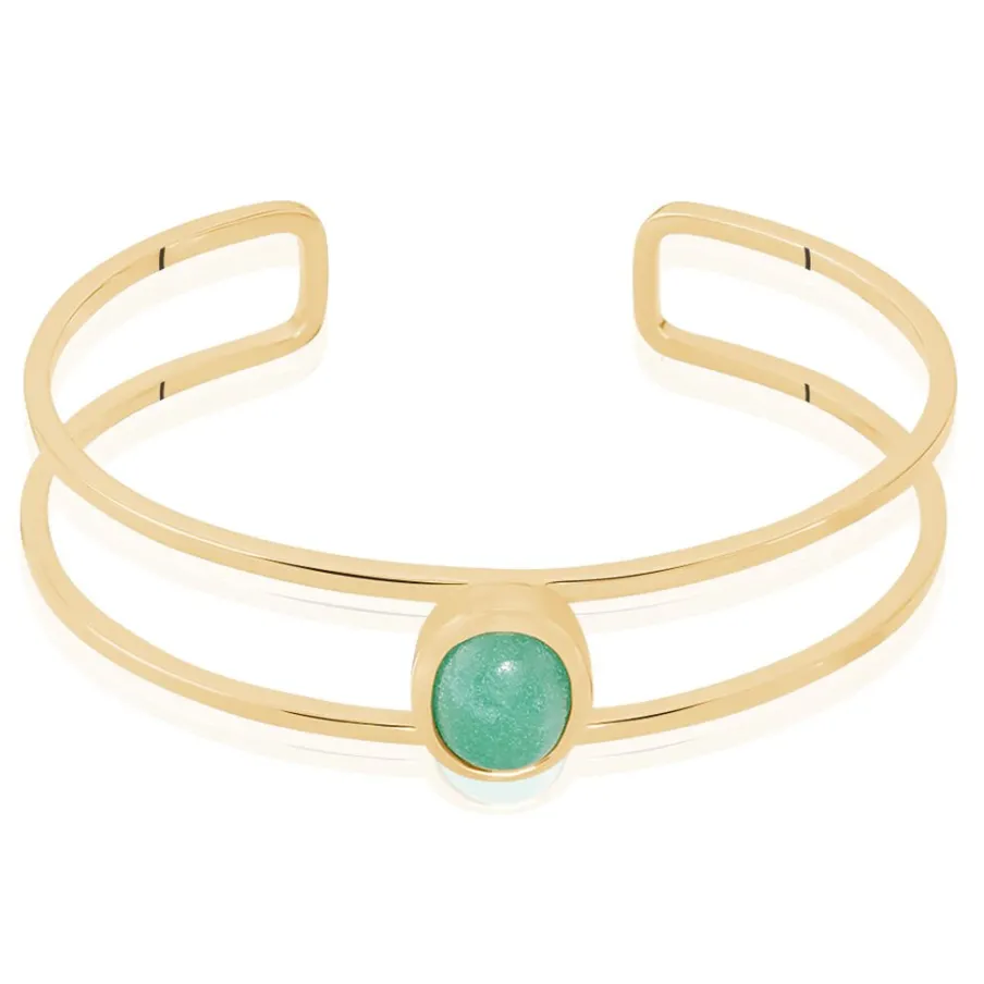 Bracelet Jonc Plaqué Or Jaune Ouvert Avec Aventurine Ovale Verte Serti Clos Diametre 58mm