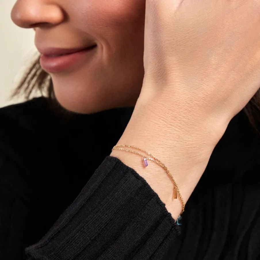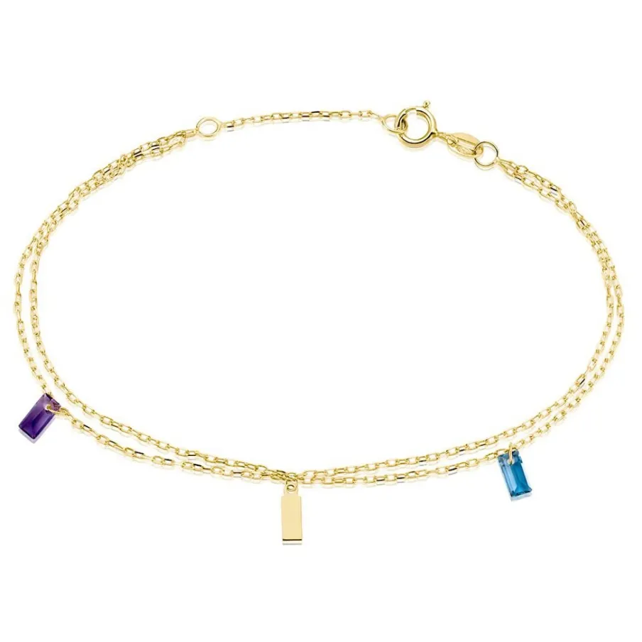 Bracelet Or Jaune 375/1000 Amethyste Violet Topaze London Blue Baguette Maille Forcat 16+2cm