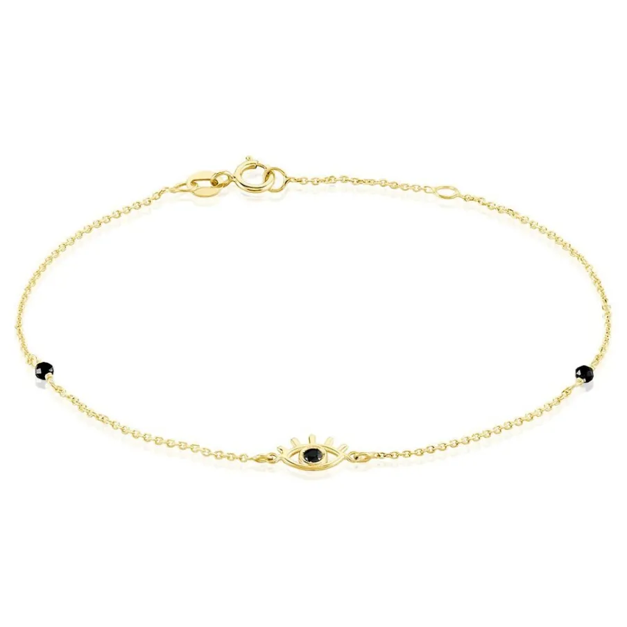 Bracelet Or Jaune 375/1000 Oeil Oxydes De Zirconium Et Spinelles Noirs Maille Jaseron 16+2cm