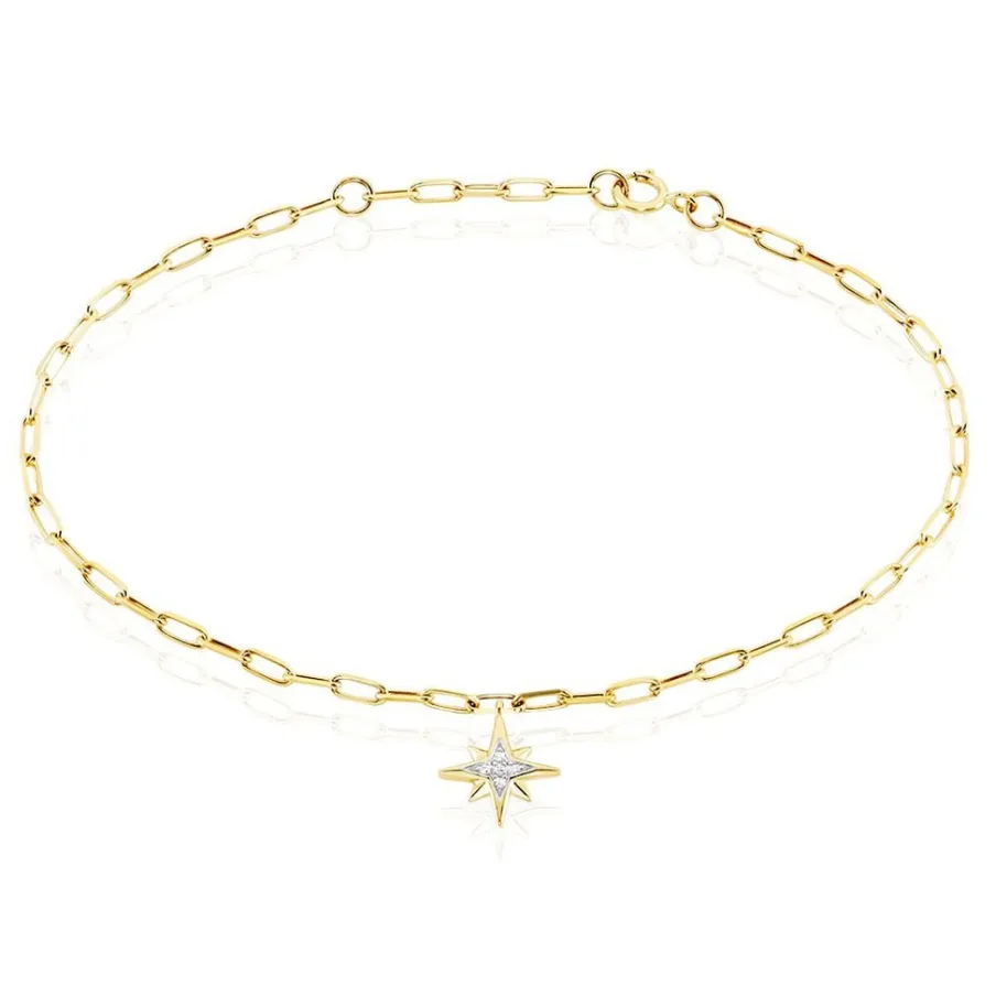 Bracelet Or Jaune 375/1000 Motif Etoile Diamants 0.028cts Micro Serti Maille Cheval 16+2cm