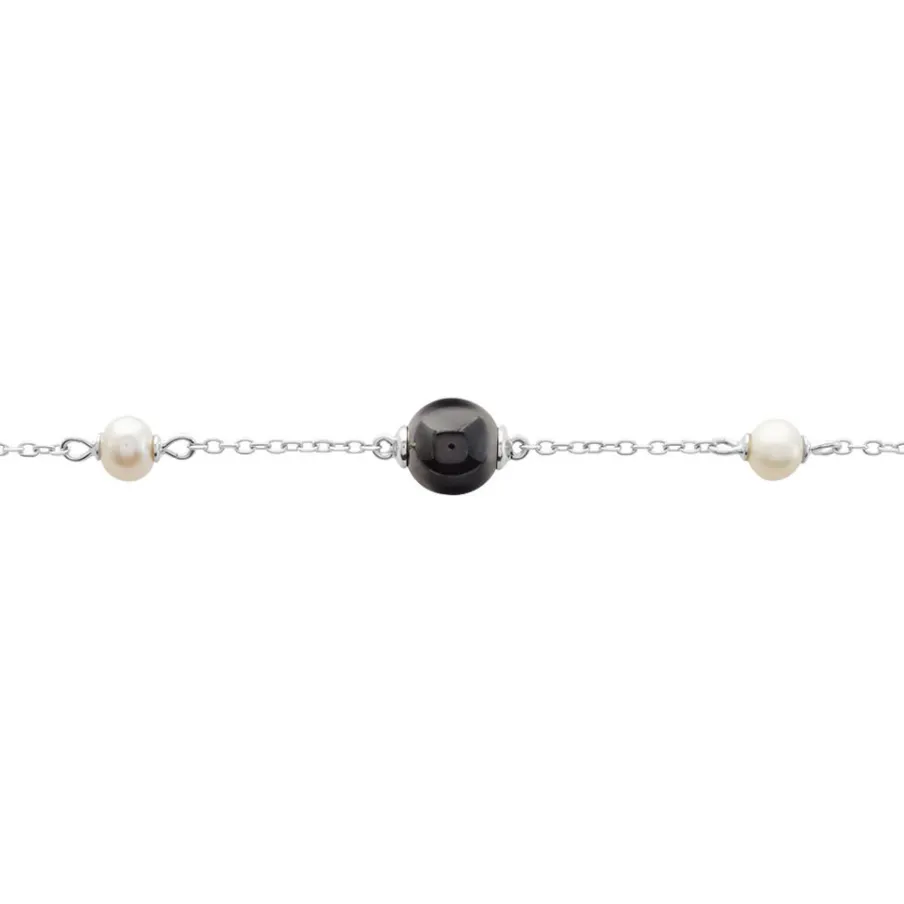 Bracelet Argent Blanc 925/1000 Perles De Culture Et Boules Ceramique Noire Maille Forcat 19cm