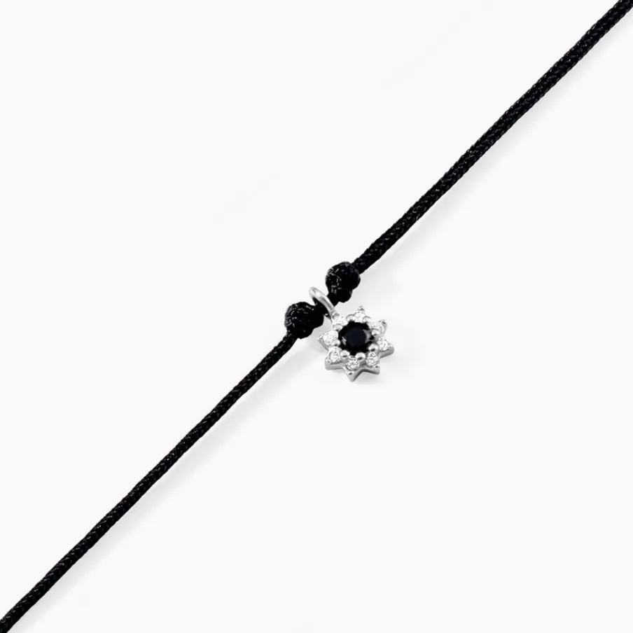 Bracelet Argent Blanc 925/1000 Soleil Oxyde De Zirconium Noir Central Entourage Oxydes De Zirconium Cordon Noir 23.5cm