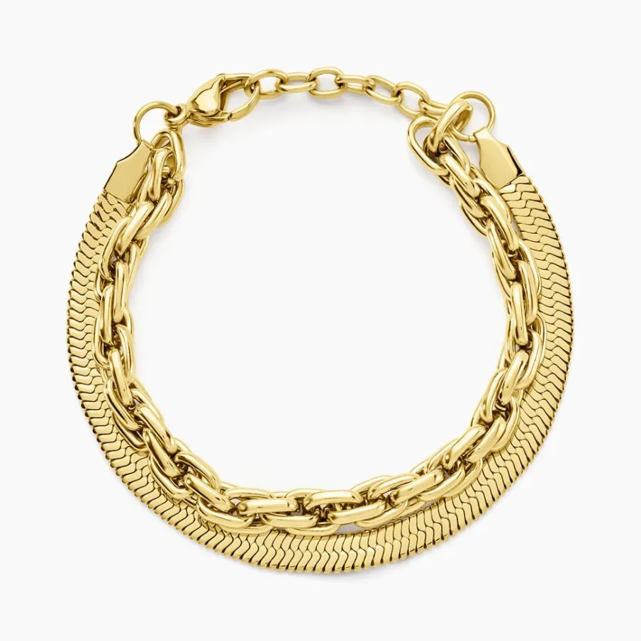 Bracelet Acier Inoxydable Jaune Double Rang Mailles Miroir Et Tresse Largeur 5mm 16+3cm