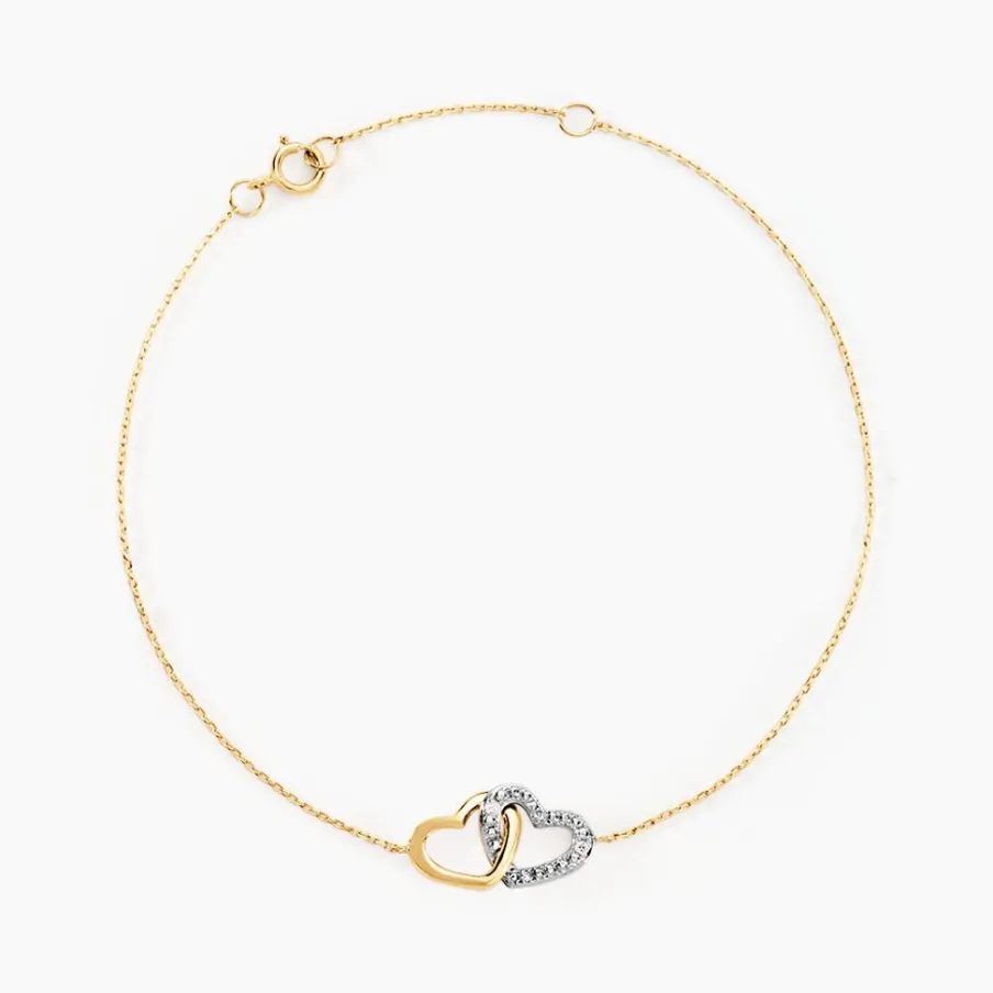 Bracelet Or Jaune 375/1000 Forme Double C艙ur Pavage Diamants Maille Forçat 18cm