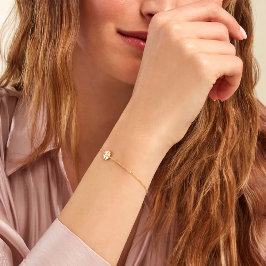 Bracelet Or Jaune 375/1000 Fleur De Trefle 1 Oxyde De Zirconium Serti 4 Griffes Maille Jaseron 16+2cm