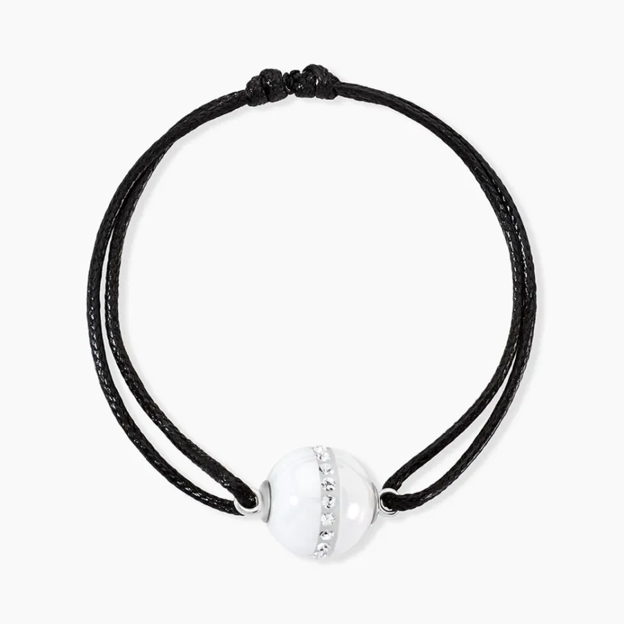Bracelet Argent Blanc 925/1000 Boule Ceramique Blanche Lisse Pierres Blanches Sur Cordon Noir