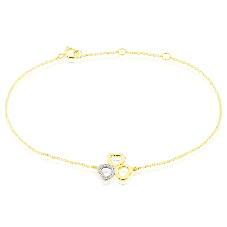 Bracelet Or Jaune 375/1000 Forme Triple C艙urs Maille Forçat Pavage Diamants 18.5cm