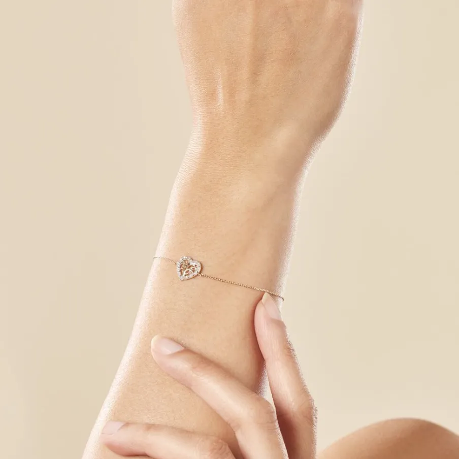 Bracelet Or Jaune 375/1000 Arbre De Vie Forme C艙ur Pavage Diamants Maille Forçat 18cm