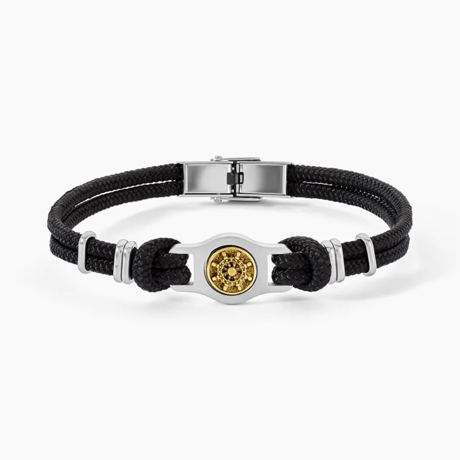 Bracelet Acier Inoxydable Blanc Cordon Noir Pastille Centrale Motif Gourvernail 21cm
