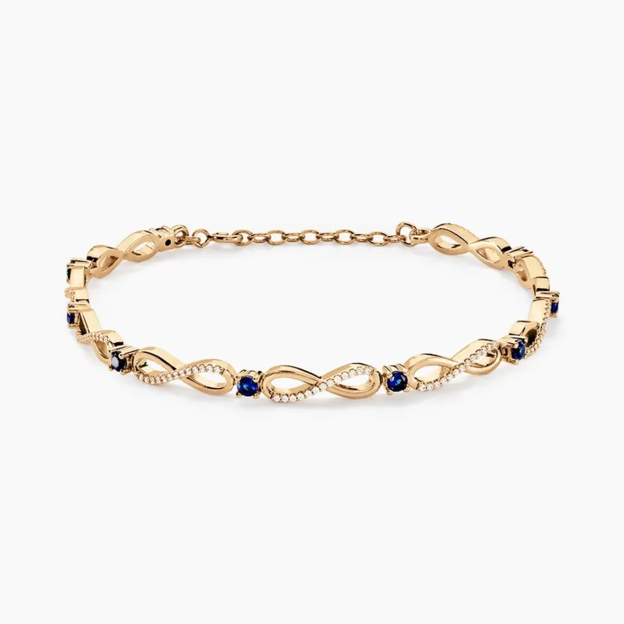 Bracelet Plaque Or Jaune Maille Fantaisie Infinis Pavage Oxydes De Zirconium Et Pierres Bleues 23cm
