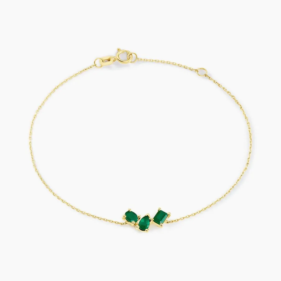 Bracelet Or Jaune 375/1000 Trilogie Emeraude Serti Griffes Maille Forcat 16+2cm