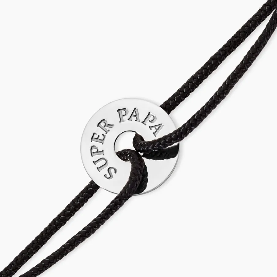 Bracelet Argent Blanc 925/1000 Cercle Gravé Super Papa Cordon Noir 19cm