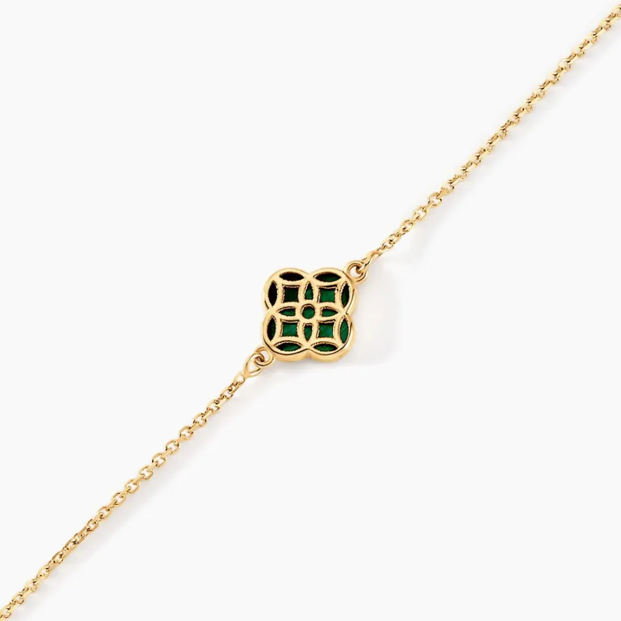 Bracelet Or Jaune 375/1000 Fleur Rosace Malachite Verte Maille Jaseron 16+2cm