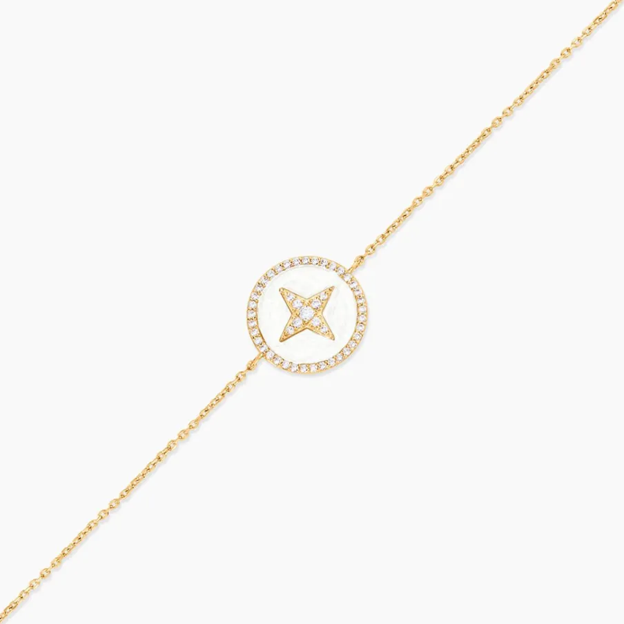 Bracelet Or Jaune 375/1000 Email Blanc Etoile Oxyde De Zirconium Blanc Serti Pavage Maille Forçat 16+2cm