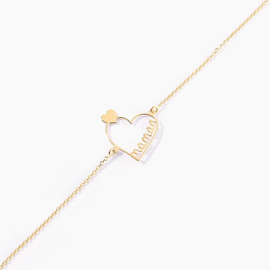 Bracelet Or Jaune 375/1000 Coeur Penche Ajoure + Petit C艙ur Plein Message Maman Maille Jaseron 18cm