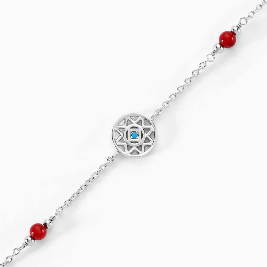 Bracelet Argent Blanc 925/1000 Pastille Ajourée Motif Rosace Et Boules Corail Rouge Maille Jaseron 17+3cm