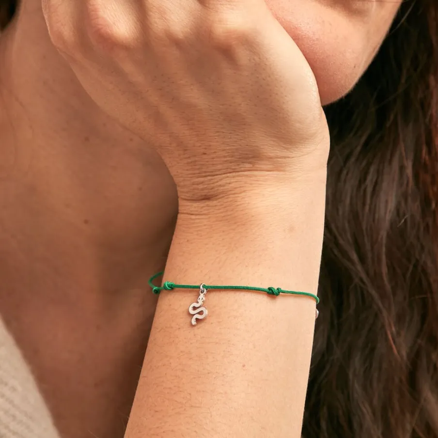 Bracelet Argent Blanc 925/1000 Pampille Serpent Cordon Vert Ajustable