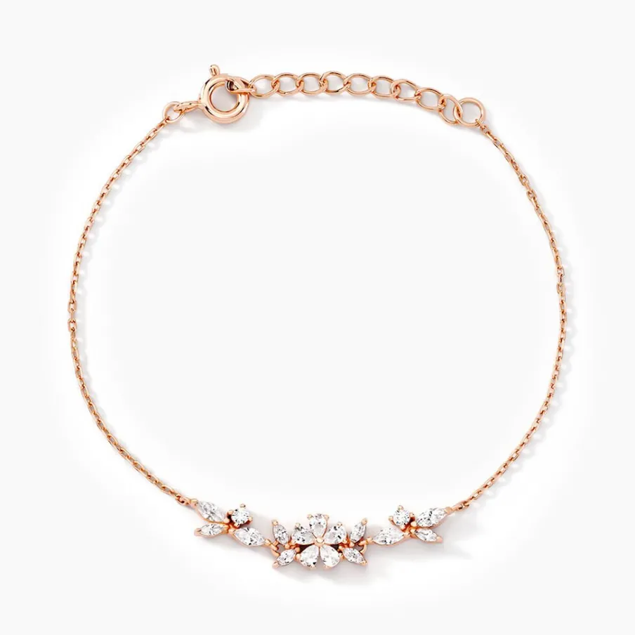 Bracelet Argent Rose 925/1000 Motif Fleur Et Feuilles Oxydes De Zirconium 18.5cm