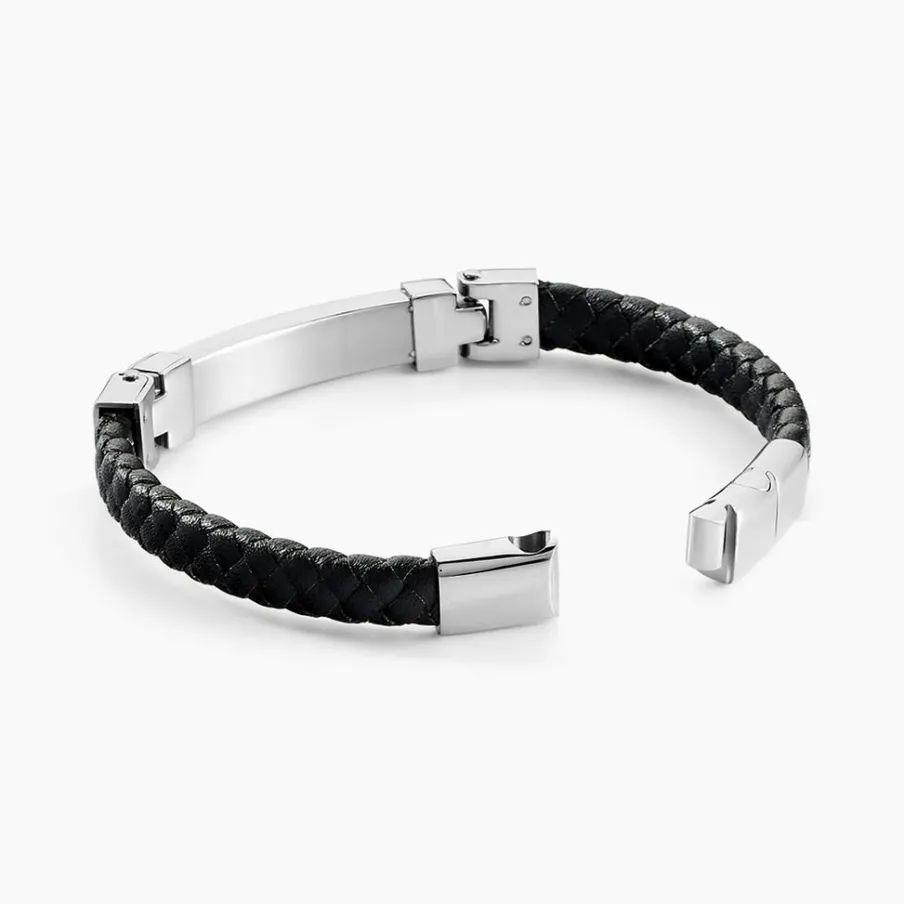 Bracelet Acier Inoxydable Blanc Cuir De Vache Noir Tressé Plaque Acier Inoxydable Ip Noir Et Cables 21cm