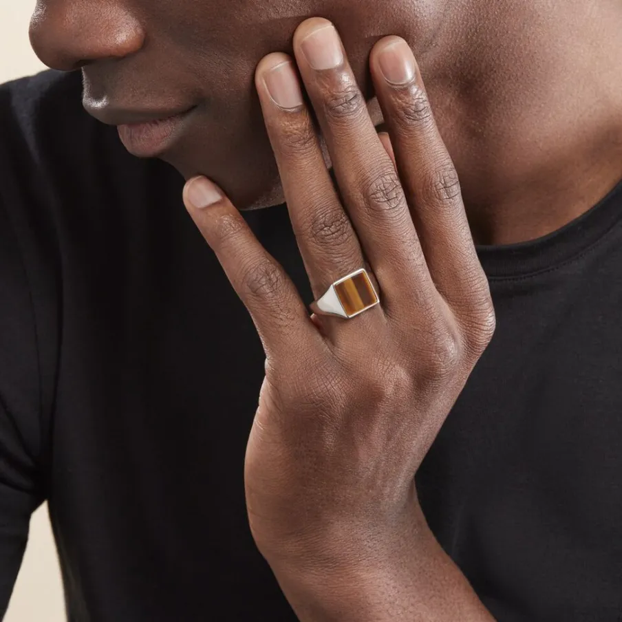 Chevalière Argent Blanc 925/1000 Forme Carré Oeil De Tigre