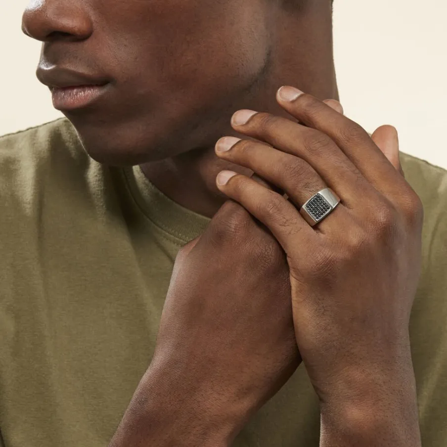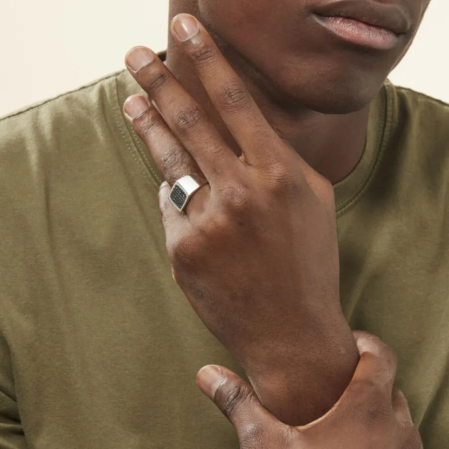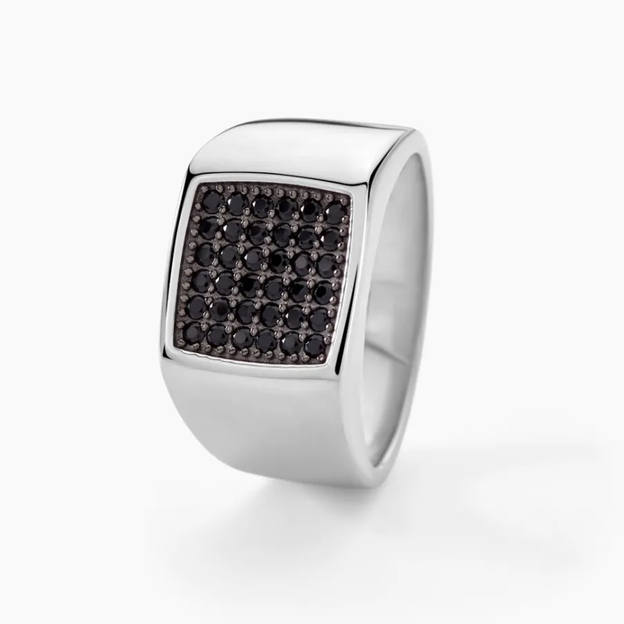 Chevaliere Argent Blanc 925/1000 Plateau Carre Oxydes De Zirconium Noirs
