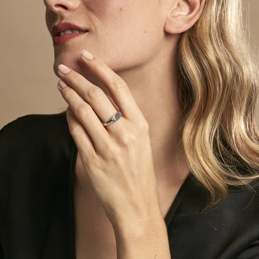 Chevalière Argent Blanc 925/1000 Plateau Carre Bords Diamantés