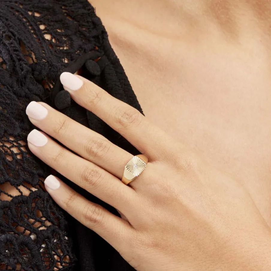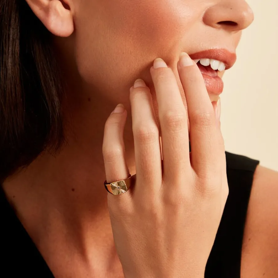 Chevaliere Plaque Or Jaune Plateau Carre Strie Oxyde De Zirconium Serti Clos