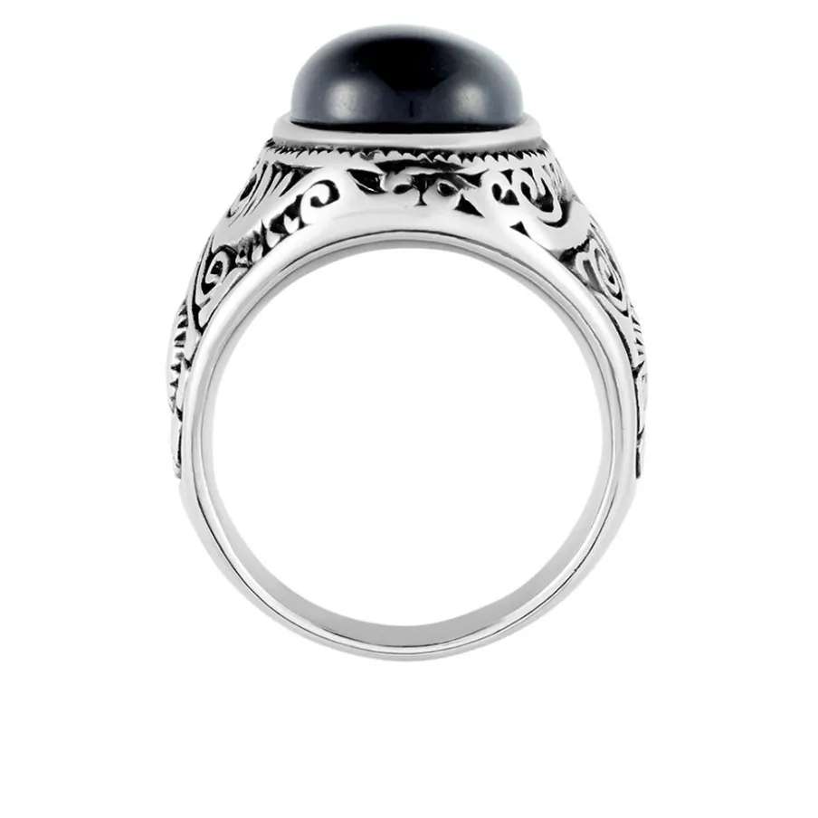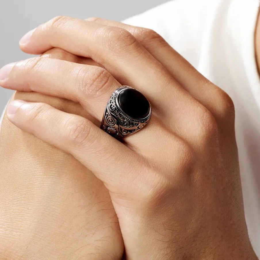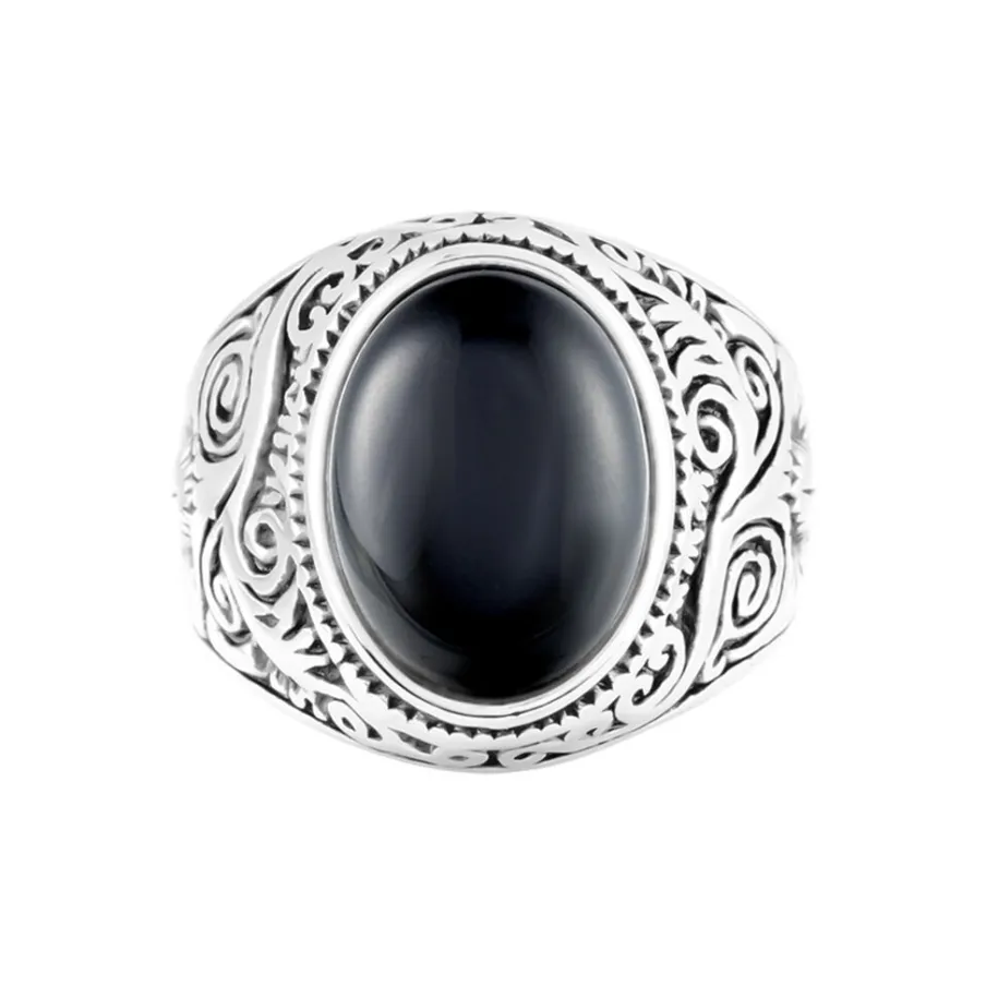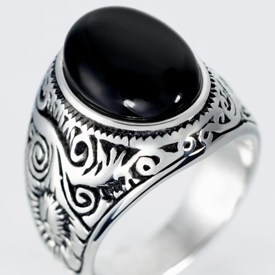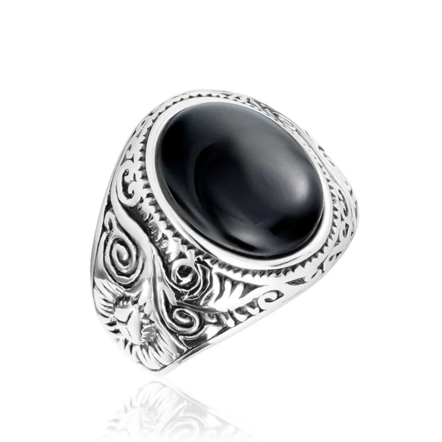 Chevaliere Acier Inoxydable Blanc Corps De Bague Grave Pierre Noire Synthetique