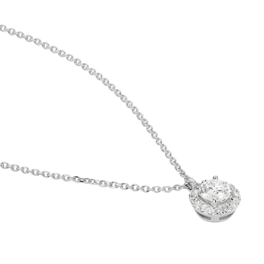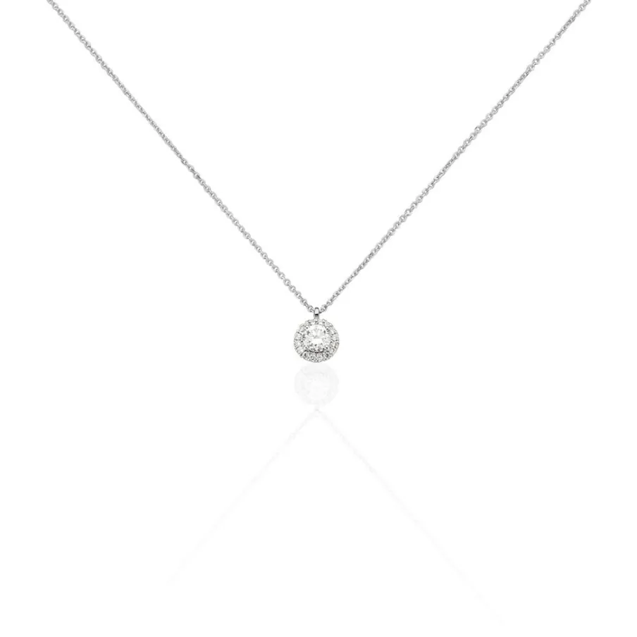 Collier Or Blanc 375/1000 1 Diamant Central 0.32cts Entourage Diamants 45cm