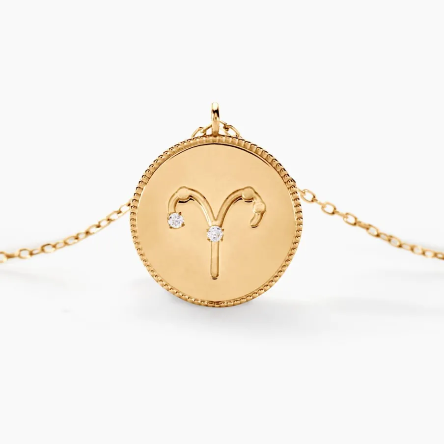 Collier Or Jaune 375/1000 Pastille Zodiaque Belier Diamant Maille Forcat 40+2cm