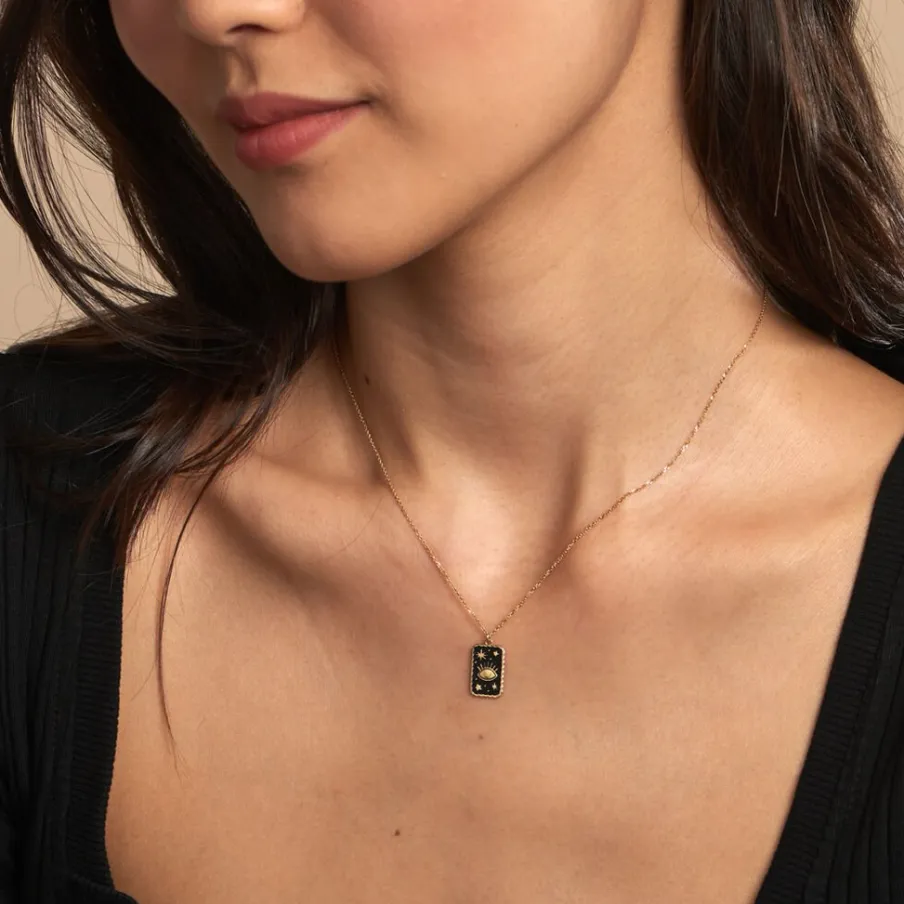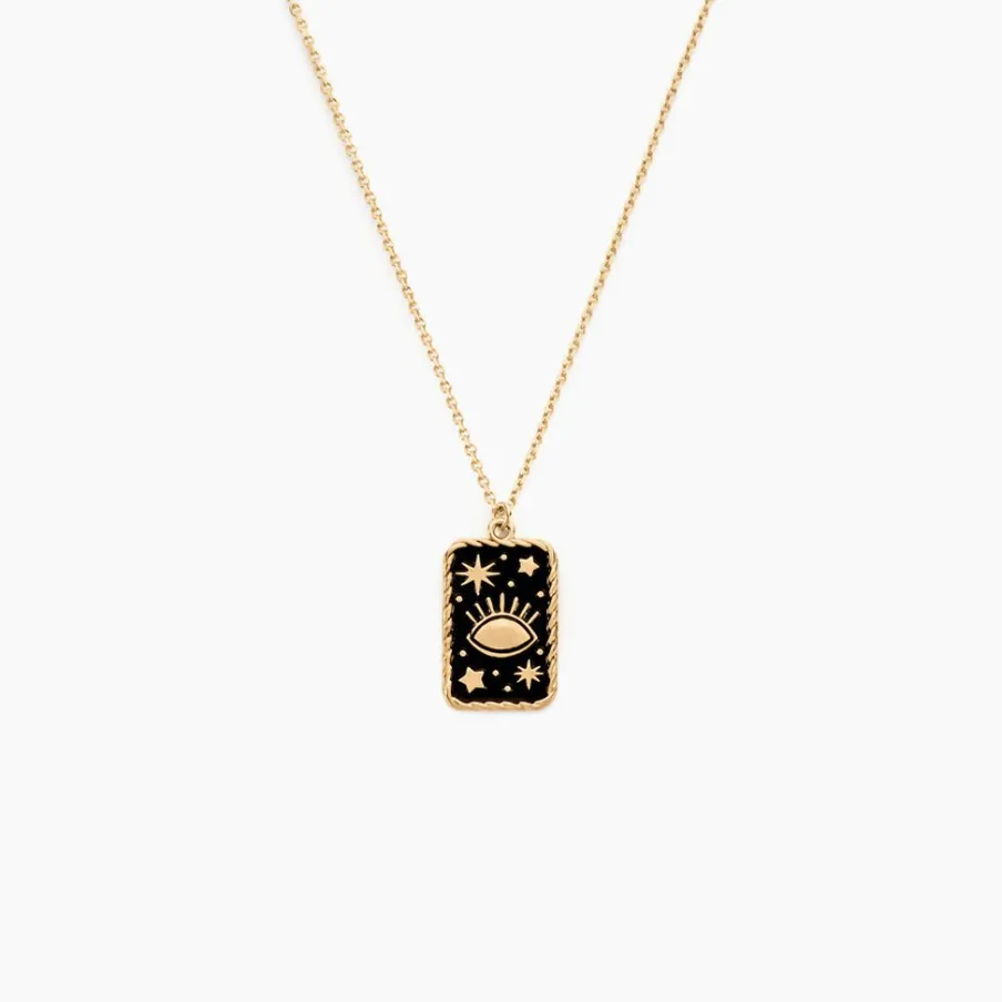 Collier Or Jaune 375/1000 Oeil Plaque Rectangle Email Noir Maille Jaseron 40+2cm