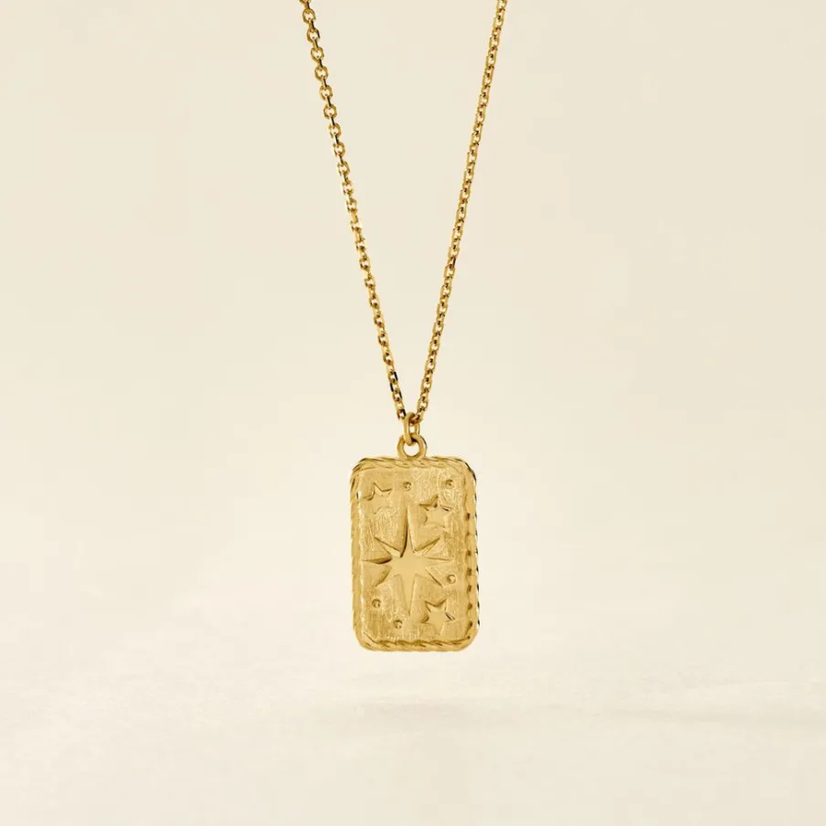 Collier Or Jaune 375/1000 Etoile Astrale Plaque Rectangle Maille Jaseron 40+2cm