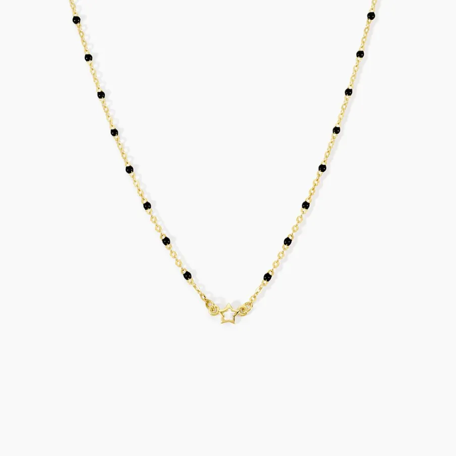 Collier Court Argent Jaune 925/1000 Étoile Oxyde De Zirconium Serti Clos Boules Email Noir Maille Forcat 35+3Cm