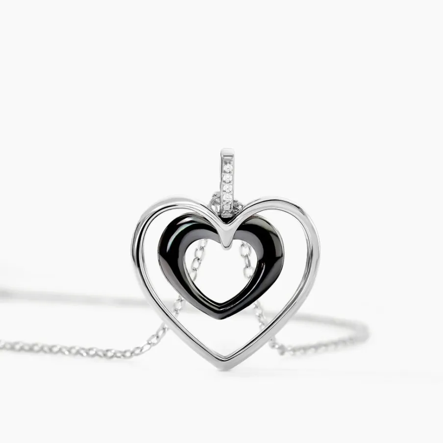 Collier Argent Blanc 925/1000 Coeur Ceramique Noire Et Coeur Argent Blanc 925/1000 Oxydes De Zirconium 45cm