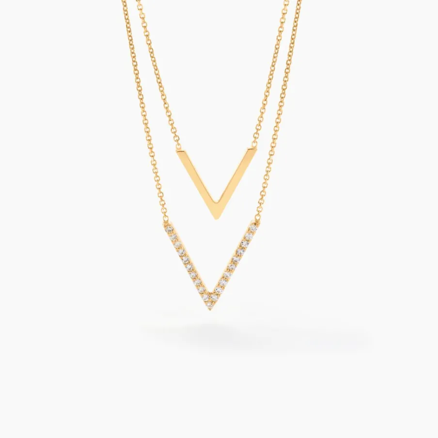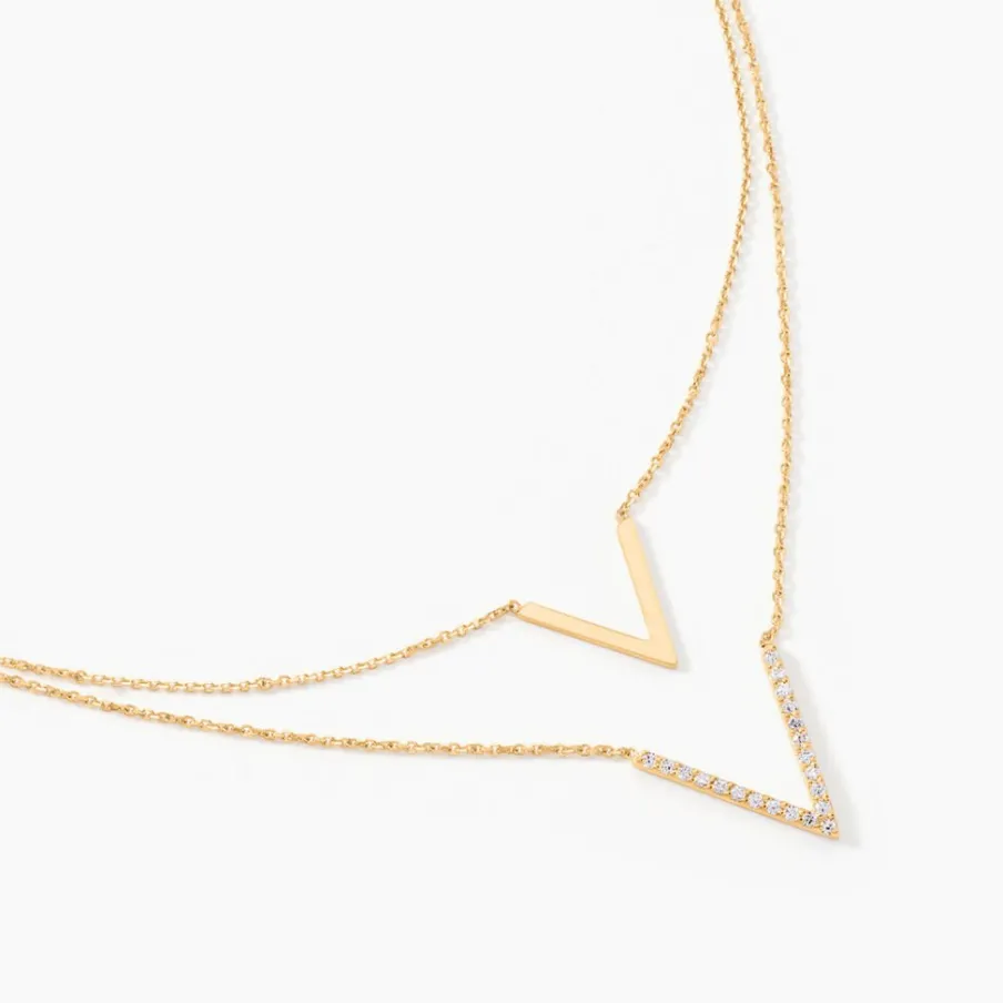 Collier Or Jaune 375/1000 Doubles Chaines Formes V Oxydes De Zirconium 42 Cm