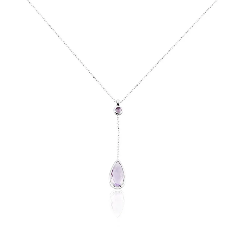 Collier Or Blanc 375/1000 Maille Forçat Améthyste Forme Poire Sertie Clos Et Améthyste Forme Ronde Sertis Clos 42cm