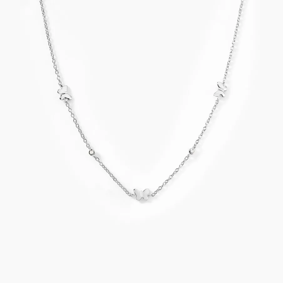 Collier Argent Blanc 925/1000 Papillons Et Oxydes De Zirconium Maille Jaseron 40+2cm