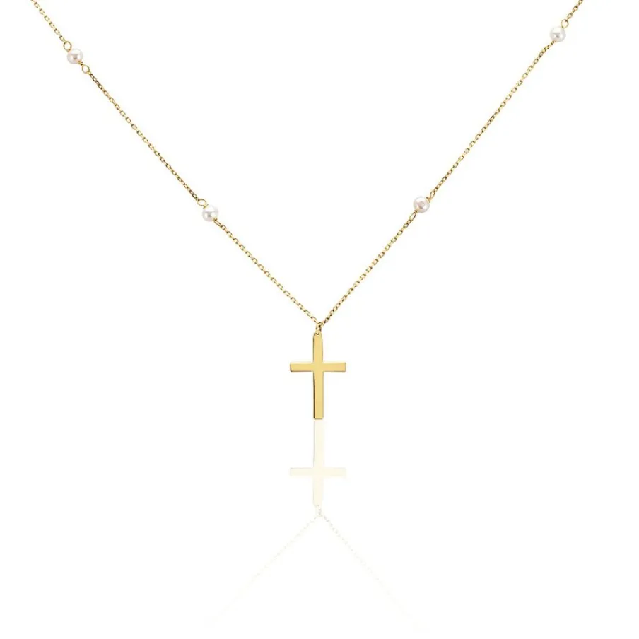 Collier Or Jaune 375/1000 Croix Lisse 4 Perles De Culture Blanches Percees Maille Forcat 40+2cm