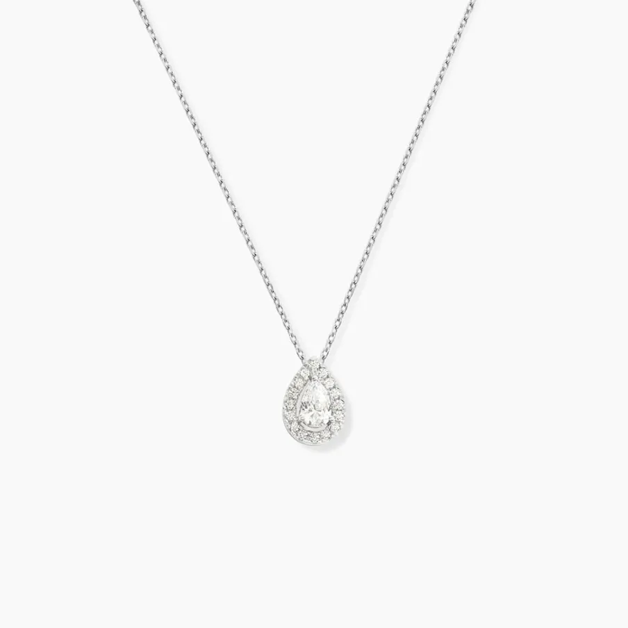 Collier Or Blanc 375/1000 Solitaire Oxyde De Zirconium Central Forme Poire Entourage Oxydes De Zirconium 42cm