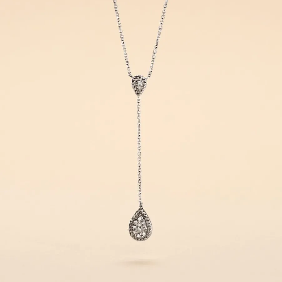 Collier Or Blanc 375/1000 Cravate Forme Goutte Pavage Diamants 42cm