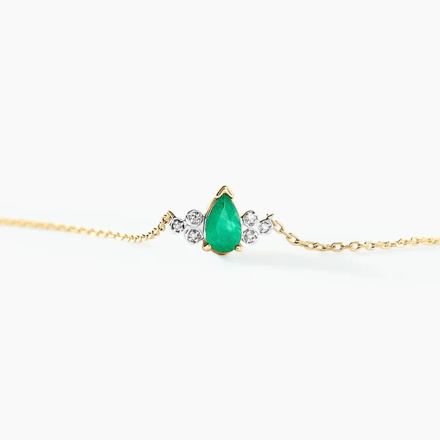 Collier Or Jaune 375/1000 Goutte Emeraude 0.20cts Serti Griffes Accompagnée Pavage Diamants Maille Forcat 40+2cm