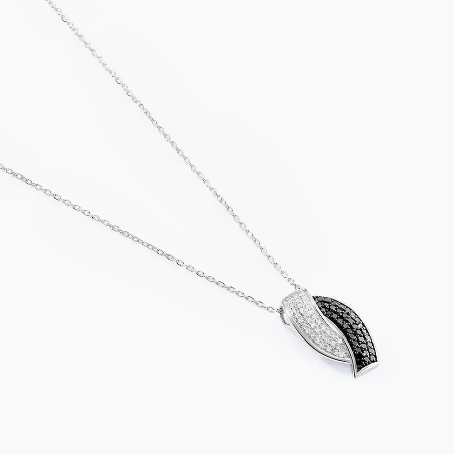 Collier Or Blanc 375/1000 Forme Croisée Diamants Noirs Et Diamants Blancs 42cm